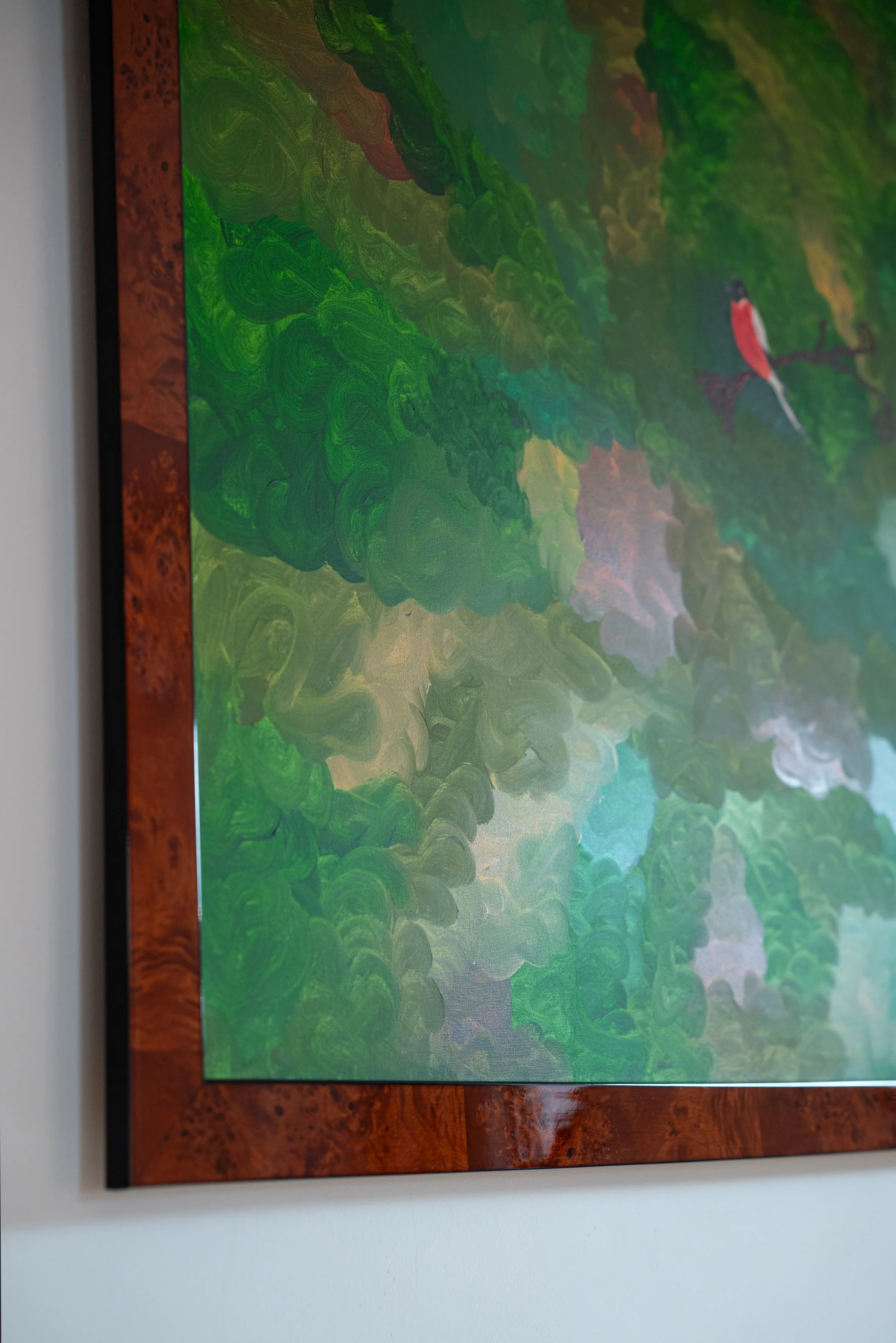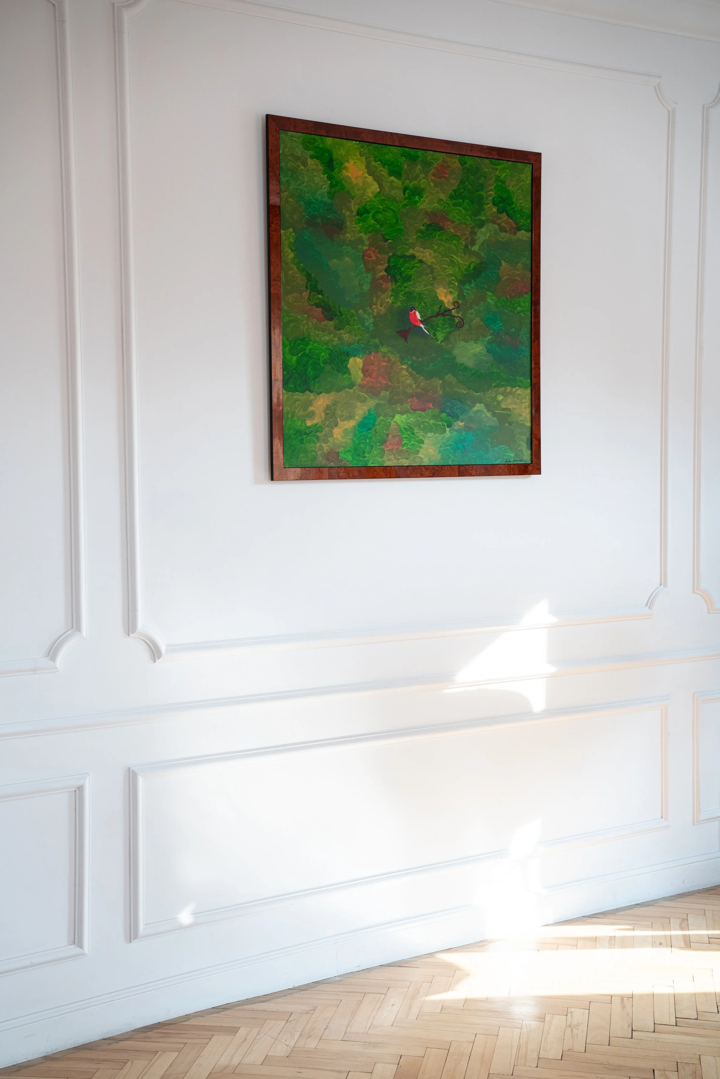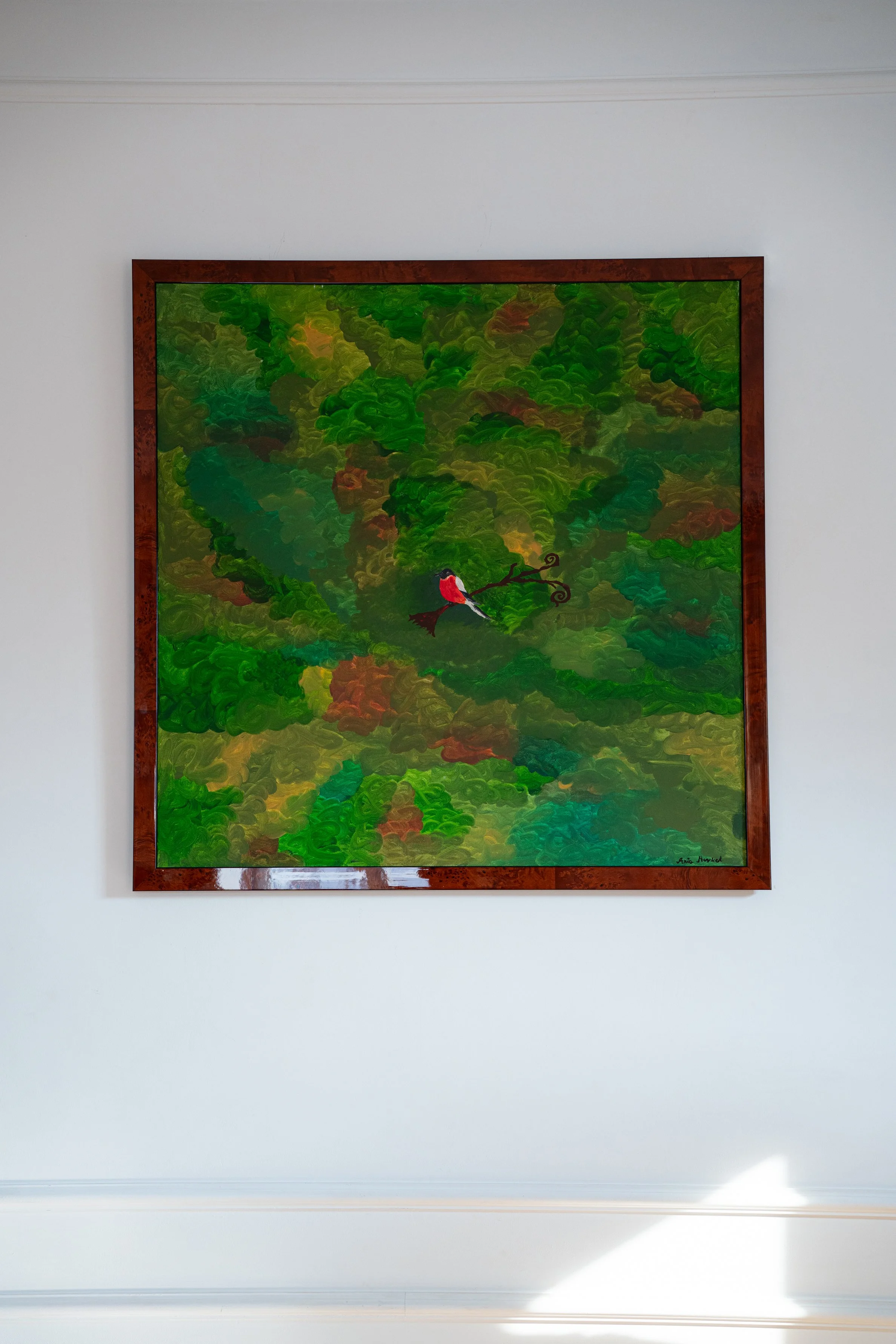 "The Ruby Bird”, a painting in interpretation of Tadeusz Różewicz's poem "The Amber Bird," depicts and describes transience. The second bird, in turn, represents a bullfinch, the ruby bird, which carries a drop of blood from branch to branch. All the birds I chose appear in Poland during the autumn season. The bullfinch foreshadows something sad and unknown; it is an image of adulthood and old age. In symbolism, the animal signifies the need to be honest with oneself and not to worry about the opinions of others. Inner beauty means that we will also be beautiful on the outside, which is why we should care for spiritual development and be guided by the heart and positive emotions in life. It teaches how to maintain harmony in emotions.